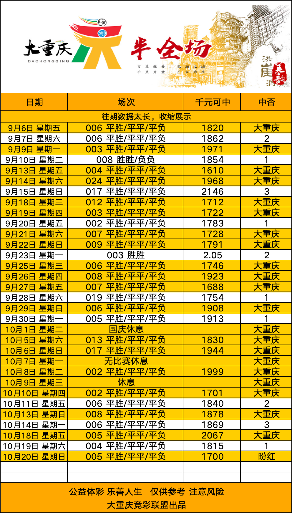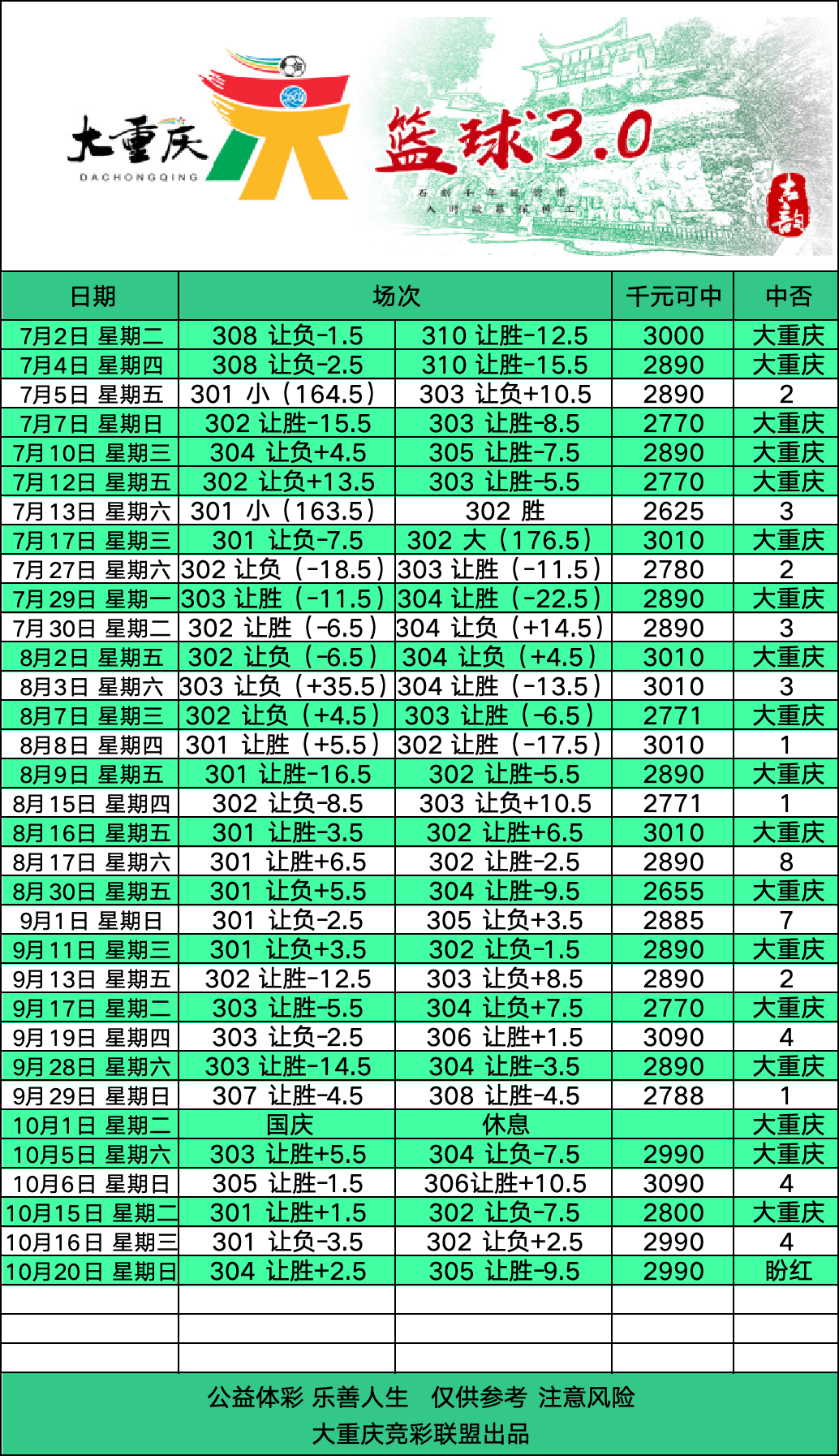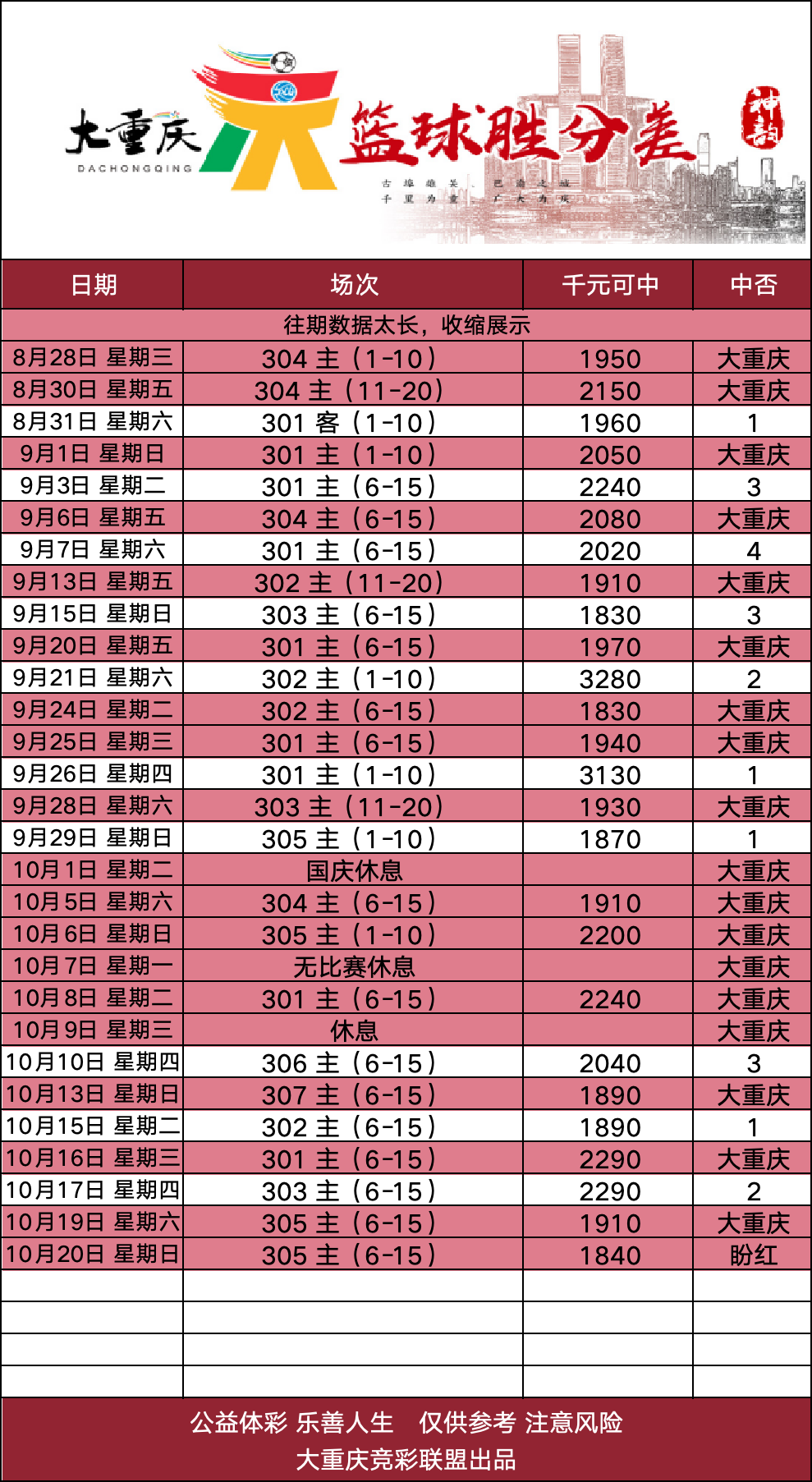 【注意:大重庆足球4倍财韵、10倍幸韵、篮球2.0食韵本轮中出则暂停更新,未来一段时间将保持大重庆6个主打方案】