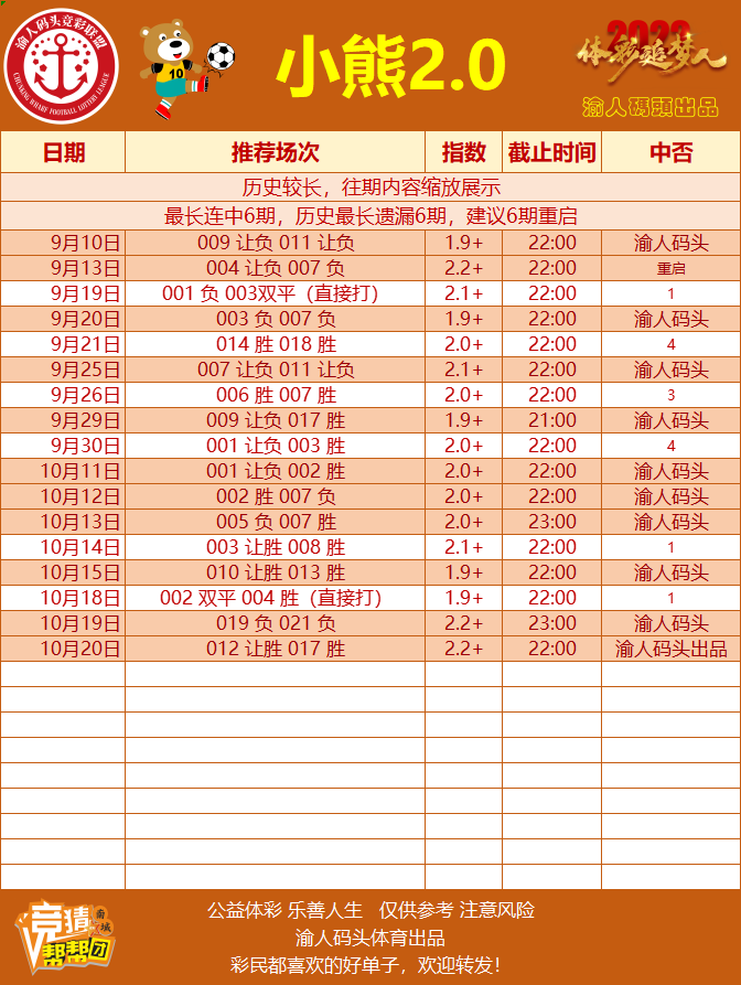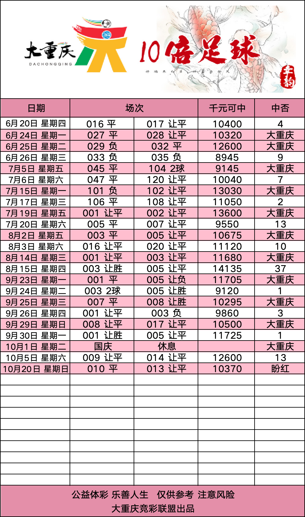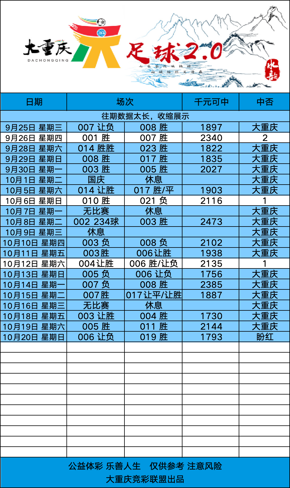 【注意:大重庆足球4倍财韵、10倍幸韵、篮球2.0食韵本轮中出则暂停更新,未来一段时间将保持大重庆6个主打方案】